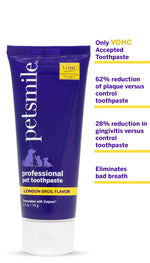 Unit price perPetsmile Professional Pet Toothpaste is the top choice recommended by veterinary dentists and the only toothpaste accepted by the Veterinary Oral Health Council (VOHC) for controlling plaque and tartar. Its unique Calprox formula gently dissolves the protein pellicle, preventing buildup and leaving your pet’s teeth cleaner, whiter, and gums healthier with fresh breath. Made in the USA with safe, human-grade ingredients, this BPA-free, vegan toothpaste supports enamel remineralization and overall oral health. Easy to use without brushing, it helps protect your pet from cavities, gum disease, and related health issues, promoting a happier, healthier life.