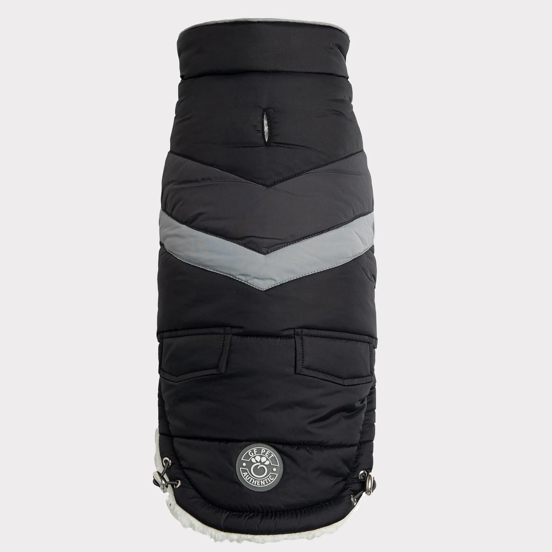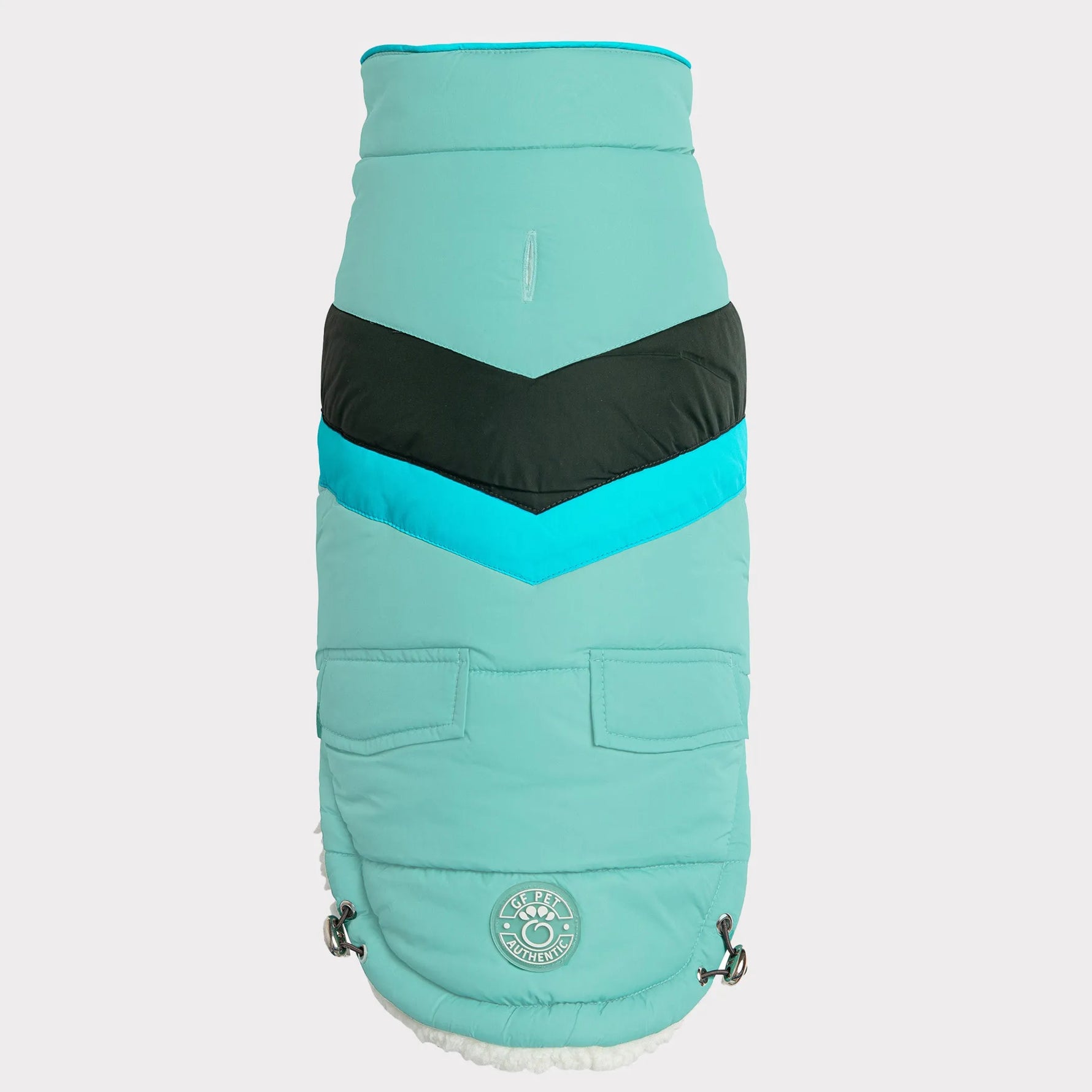 Unit price perThe GF Pet Alpine Puffer is a great choice for active dogs who are looking for carefree fashion and warmth. It's a modern take on a retro chevron design, with faux pockets and next-generation styling. With GF Pet signature contrast piping and snuggly-warm, popcorn Sherpa lining, the Alpine Puffer keeps it real. Water repellent and super-adjustable, with patented Elasto-Fit technology, this coat is designed to keep dogs looking cool while staying warm.