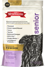 Unit price perThe Missing Link’s trusted formula for senior dogs has been improved and refreshed with a new look! This enhanced supplement combines natural, flavorful ingredients to help your aging dog stay active and healthy. It eases occasional stiffness, supports strong bones, promotes a shiny coat and healthy digestion, and boosts heart health. Key ingredients like glucosamine, New Zealand green-lipped mussel, and yucca aid mobility and comfort, while added Gingko Biloba supports brain function. Probiotics improve nutrient absorption, and balanced Omegas maintain immunity, energy, and skin health. Give your senior dog the support they deserve with The Missing Link!