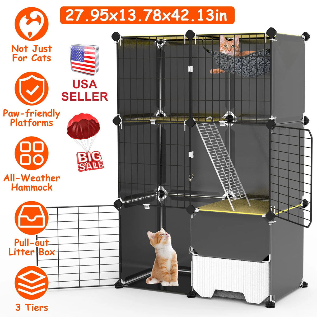 Measuring 27.95x13.78x42.13in size, our 3 tier cat cage indoor with litter box provides an exclusive villa for 1-2 kittens to live in with 4 separate areas like resting area, playing area, dining area and toilet area. Built in an enclosed litter box with pull-out drawer design, make litter cleansing a breeze. The double-sided hammock crafts from plush on one side and linen on the other side, designed for both summer and winter use. The plastic platforms is gentle to your cat's paws. Include complete accessories to install. You can also raise other small furry ones like ferrets, rats, rabbits, puppies, chinchilla and so on.