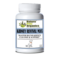 KIDNEY REVIVAL MAX for Adult and Senior Cats and Dogs* is a potent antioxidant and kidney nutritional support, containing first class adaptogens, which may help support phytochemically and nutritionally healthy kidney function, may help reduce inflammation related to kidneys, may help address damaged kidney cells and may help renew kidney cells due to anti-mutagenic actions, may help limit kidney infection, may help limit toxin load on the kidneys, may help support waste elimination produced by kidneys, may help detoxify the liver and kidneys by promoting bile production and inhibiting bacteria and fungi.